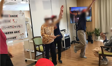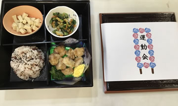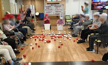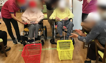 運動会では、「紙コップピンポン玉リレー」・「巻き巻き競争」・「玉入れ」・「じゃんけんバトンリレー」を実施しました。大盛り上がりでした。 また、今回はより雰囲気を出すため、皆様に赤白帽子を被って頂きました。 昼食には「運動会弁当」を召し上がって頂きました。