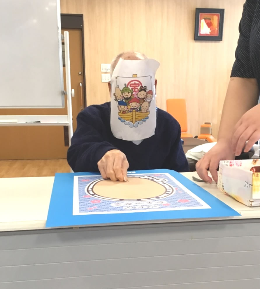 新年の初めに福笑いをしました。目隠しをした状態であった為、上手く出来なかった方も多かったですが、出来上がったものを披露すると大盛り上がりでした。出来上がった作品は持って帰って頂きました。