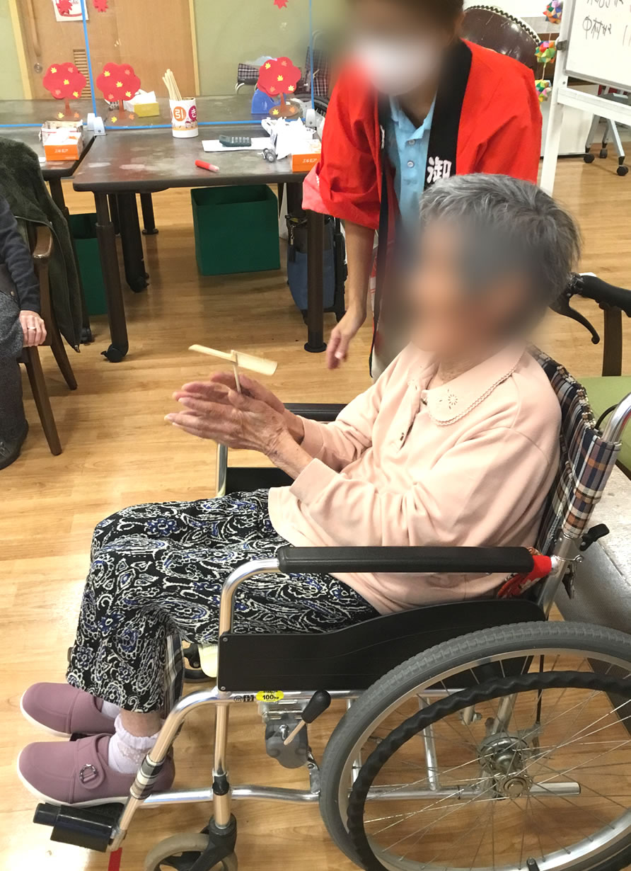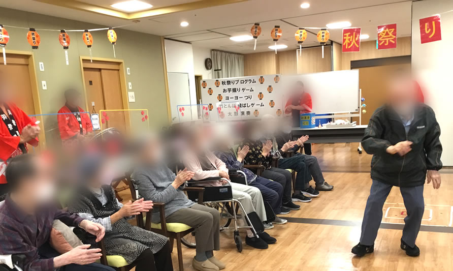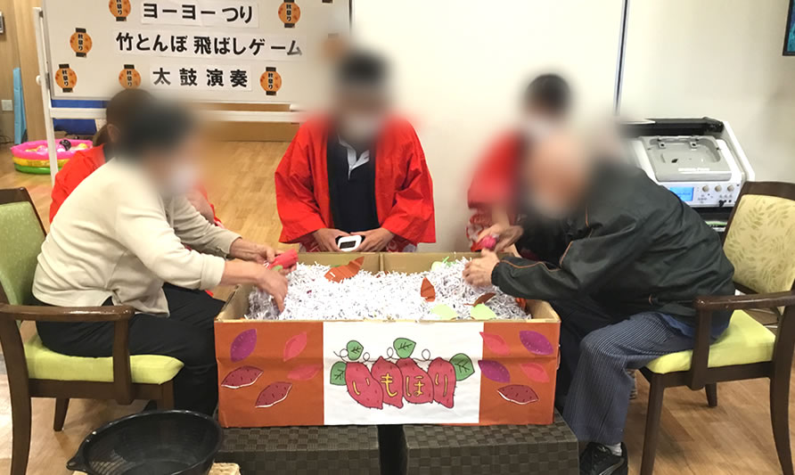 今月は「秋祭り」を開催しました。お芋掘りゲーム・ヨーヨー釣り・竹とんぼ飛ばしゲーム・太鼓演奏会の4つのプログラムを実施しました。ヨーヨー釣りと竹とんぼ飛ばしゲームは皆様少し苦戦していましたが、お芋掘りゲームは白熱して大盛り上がりでした。