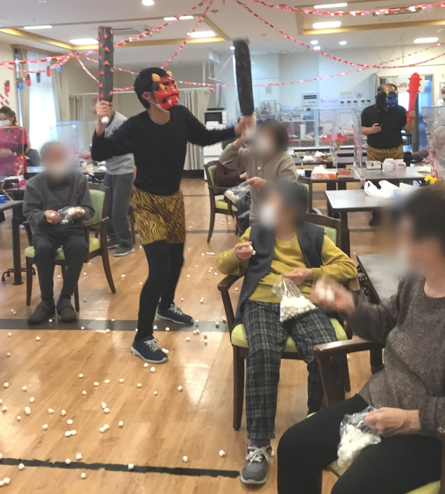 節分に職員が鬼の格好をして豆まきをしました。皆さん「鬼は外、福は内」と言いながら鬼に向かって一生懸命に豆を投げていました。豆まきの前には鬼退治ゲームもし皆さん楽しんでおられました。