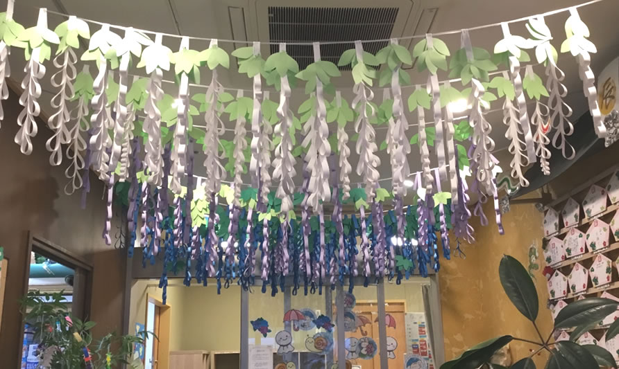 製作の時間にご利用者さんに作って頂いた「藤の花」を玄関に飾りました。作るのが少し難しかったそうですが、頑張って作っておられました。出来上がった玄関の藤の花をご覧になり「キレイやね」と話されていました。