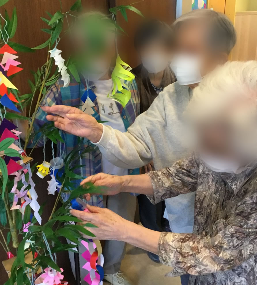 七夕の前にご利用者さんと一緒に玄関の笹の飾りつけをし、天井には皆さんのそれぞれの願いを込めて書いた短冊を飾りました。七夕当日には「天の川ゼリー」を作って美味しく召し上がりました。