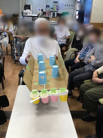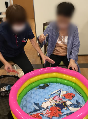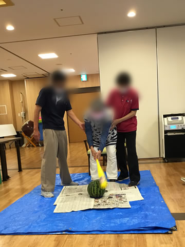 「七夕行事」では、七夕ピンボールを実施し、「海の日行事」では、魚釣り大会を実施しました。ゲームは2つとも好評で盛り上がりました。「スイカ割り」ではご利用者さんに目隠しをしてスイカを割って頂き、それをおやつに召し上がりました。スイカは「甘くておいしかった」との事でした。